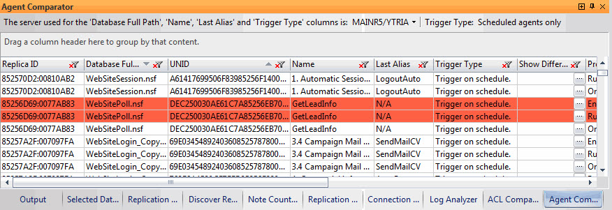 To use the Agent Comparator, select one or more replicas in the main grid and choose the 'Compare Agents' option in the right-click menu (or click Tools>Compare Agents).