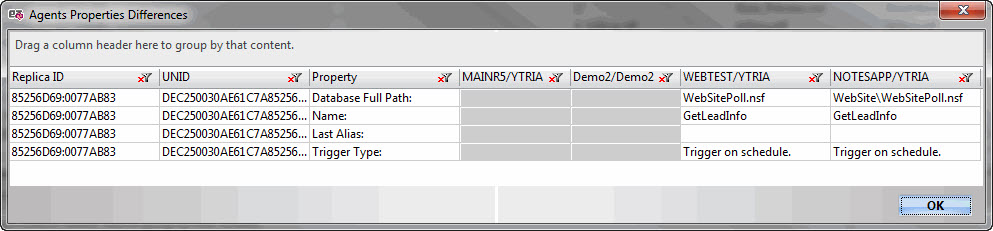 - [Servername 1][Servername 2] etc.: Each server listed in the Databases panel will be have its own column in this panel. Cells under these columns will shown a given agent property's setting on this server's replica. If a cell if grayed out under a server column it means that either the agent or the property is not present on this server.