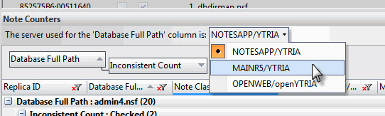 - [Server 1][Server 2][etc.]: There are also columns displayed for every server that's open in the Databases panel. You'll find a server's count for a given Note Class in the cells under these columns. If no replica was found on a given server, this cell will be grayed out.