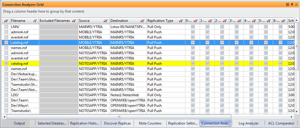 replicationEZ includes a Connection Analyzer tool to help you quickly see and interpret the connections documents for a given server. The Connection Analyzer panel uses a grid-type inferface which offers the standard grouping, filtering, customization and exportation options available in all Ytria tools' grids.