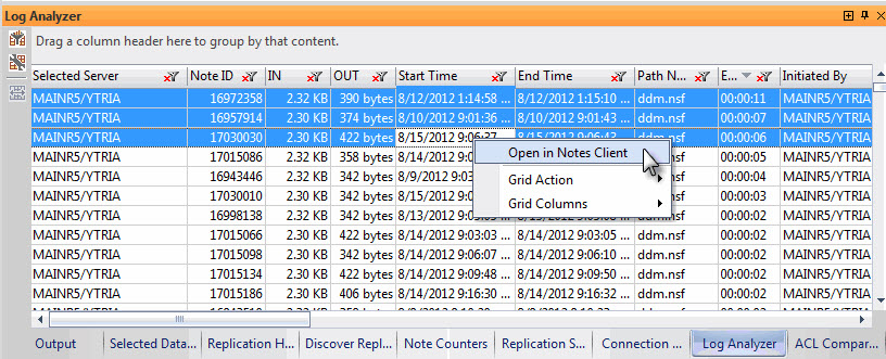 replicationEZ helps you analyze replication events information in log.nsf files for one or more servers and then sort, filter or chart this information. You have the choice of displaying this data in a flat view (standard Ytria grid) or a pivot table.