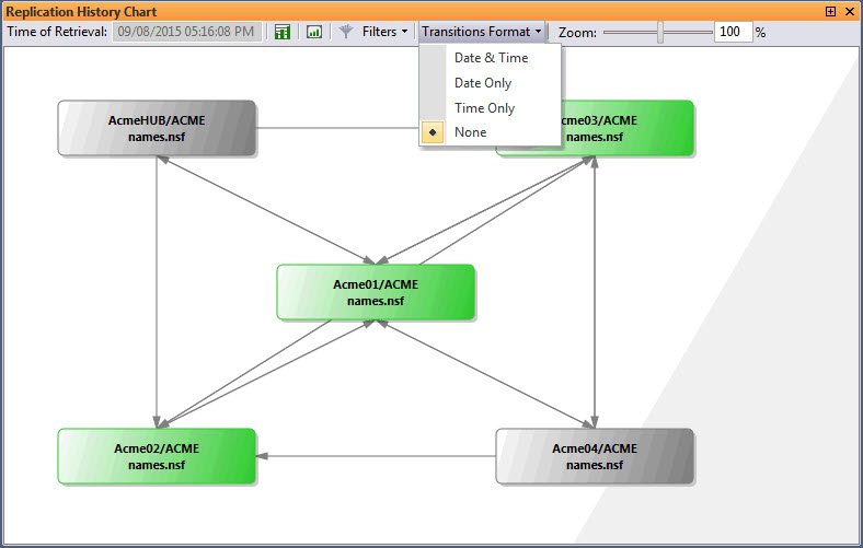 The database and transition nodes in the Replication History Chart use the following color coding in order to provide more information: