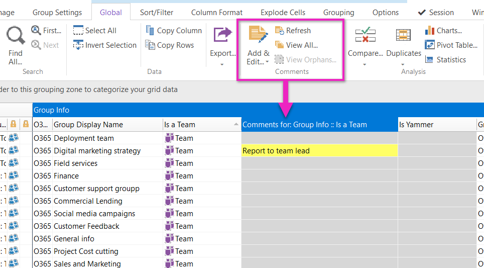The Global tab provides a range of tools for more advanced analysis such a charting, pivot table finding duplicates, comparison and statistical operations.