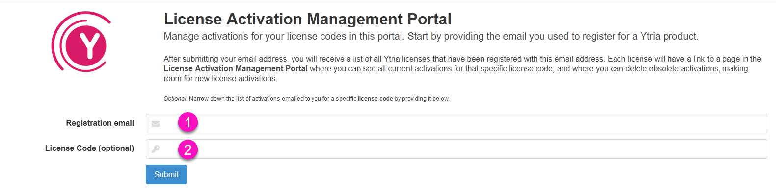 On this page, provide the email used to register one of Ytria’s products (1 in image below). An email will be sent to that address with a list of all the license codes registered by this email, and a link for each license to the portal listing all the activations for this license.