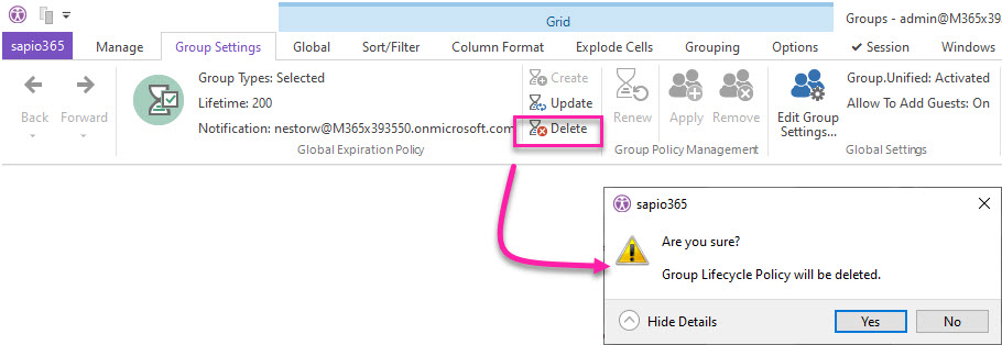Use the buttons on the right to manage the global group expiration policy for Microsoft 365 groups and Teams: