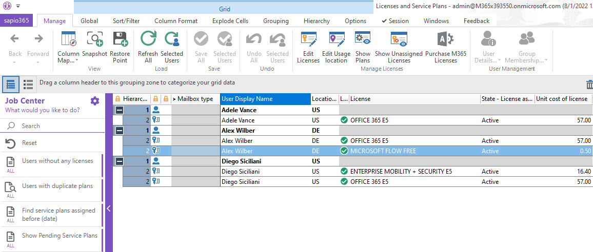 Once you retrieve assigned Microsoft 365 licenses for selected users, you can remove licenses or assign new ones, and you can manage the state of the service plans of assigned licenses. You can also update the license usage location here.