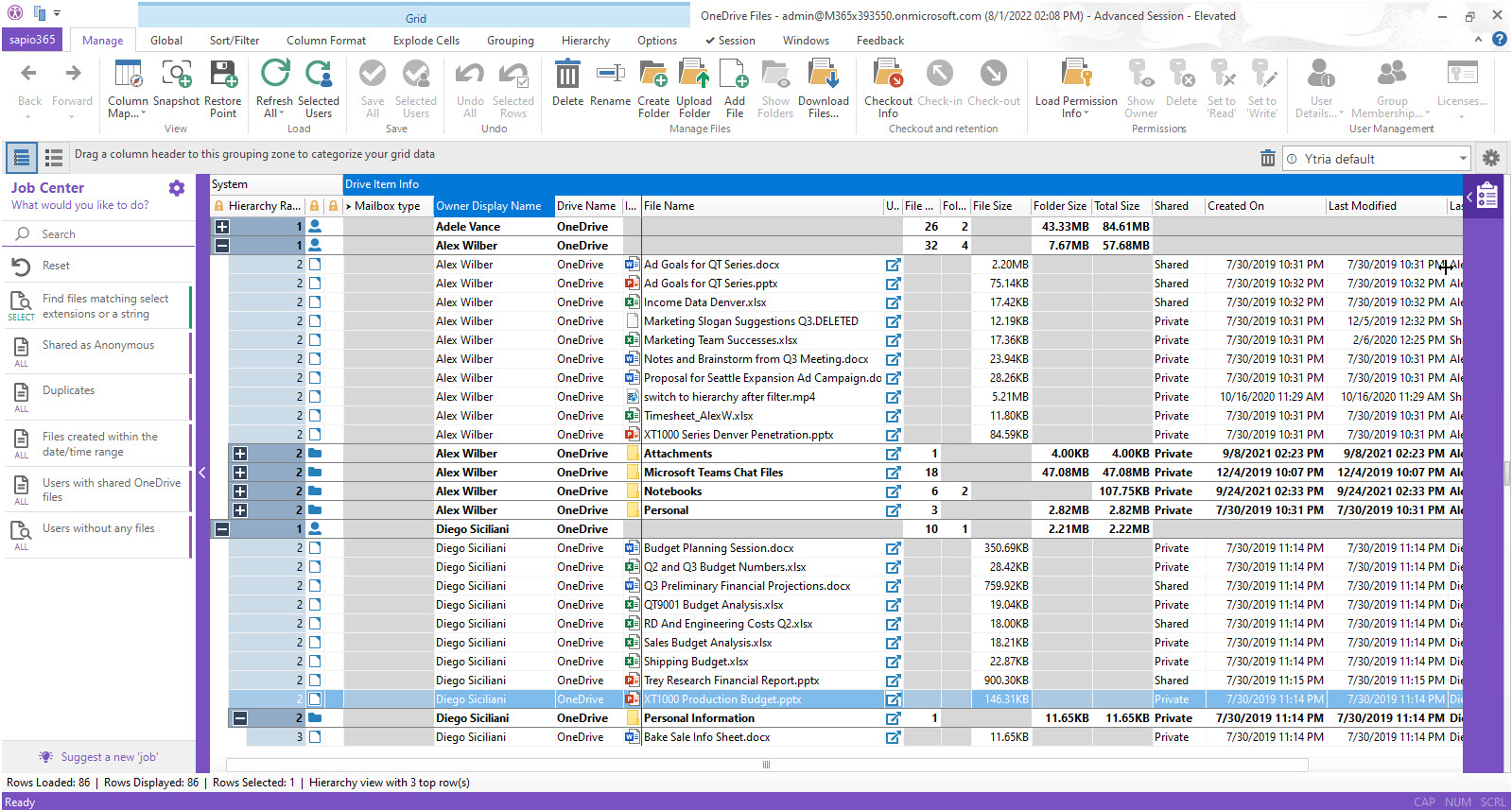 In the resulting submodule, you will see each users' files listed in within their folder hierarchy. From there, you can select documents or folders to rename, download, or to delete them from their respective OneDrive. You can also check them out or manage how they are shared (permissions).
