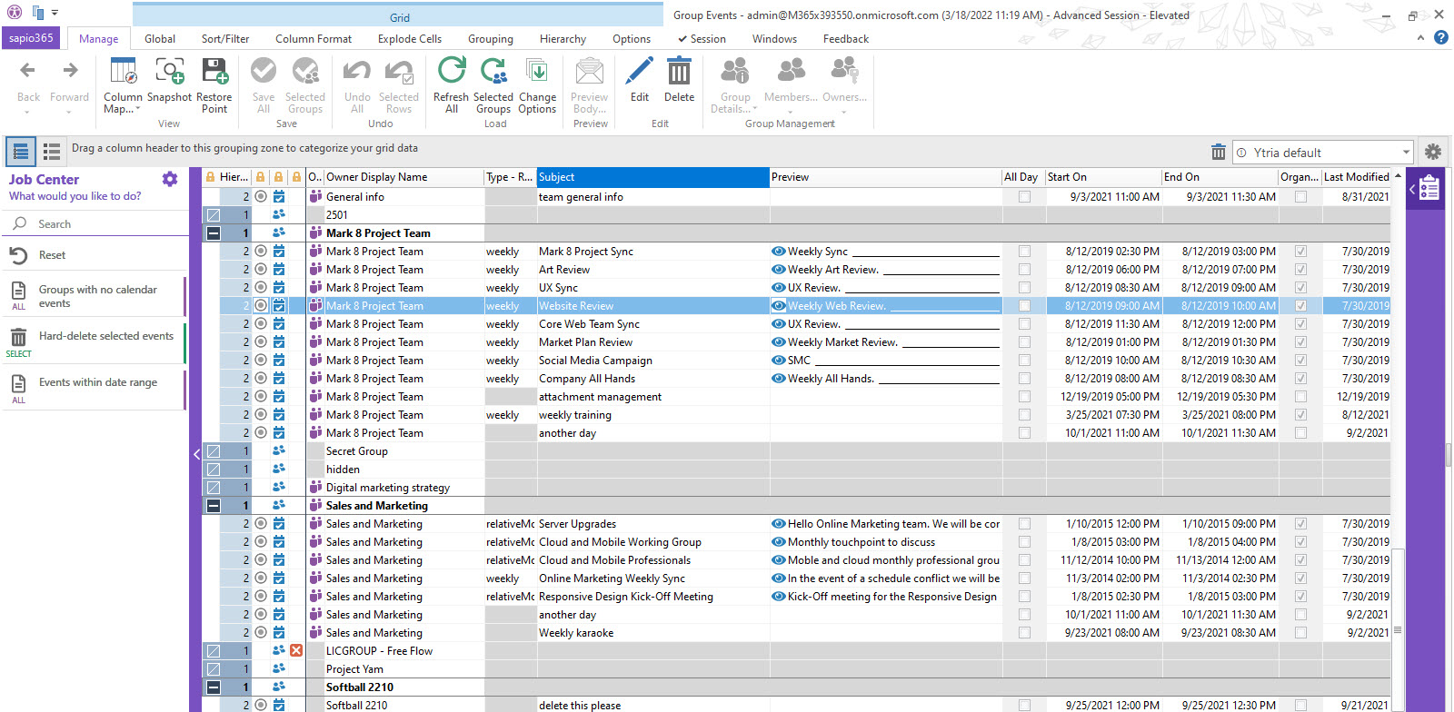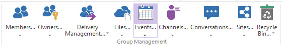 This view only applies only to Microsoft 365 groups and Teams, and lists all events connected to selected groups. Use date and advanced filters to limit the results.