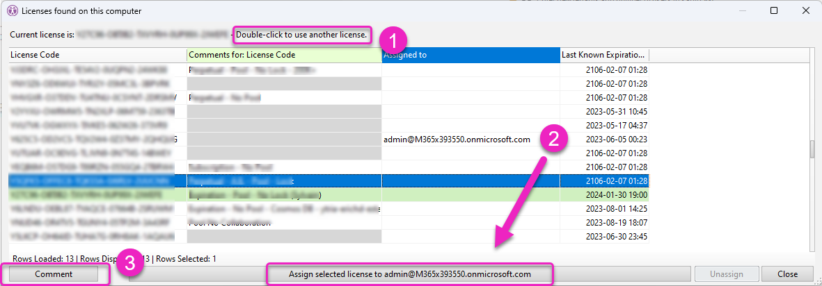 Unassign a user or assign the current user to a specific license. When a license is assigned to a user, the next time you log in with this user, the license will automatically switch to it.
