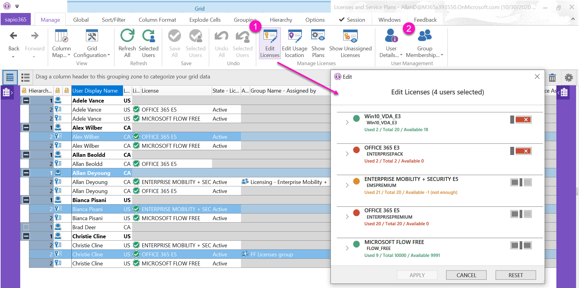 In the Licenses and Service Plans module, select the users whose licenses you want to update and click 'Edit Licenses' (1). Click on the bars to change license assignment.