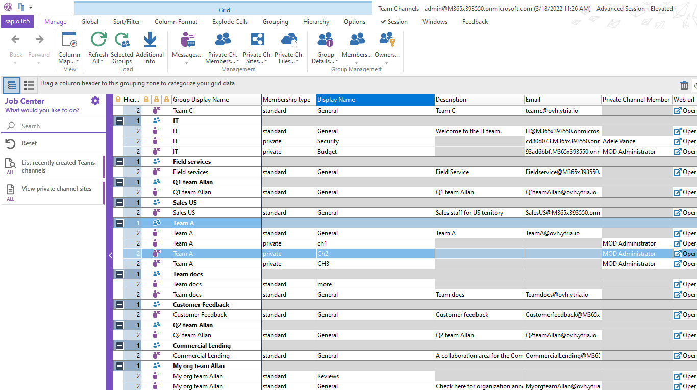 From there, you can select channels to retrieve private channel sites, to manage chats, private channels members and library documents.