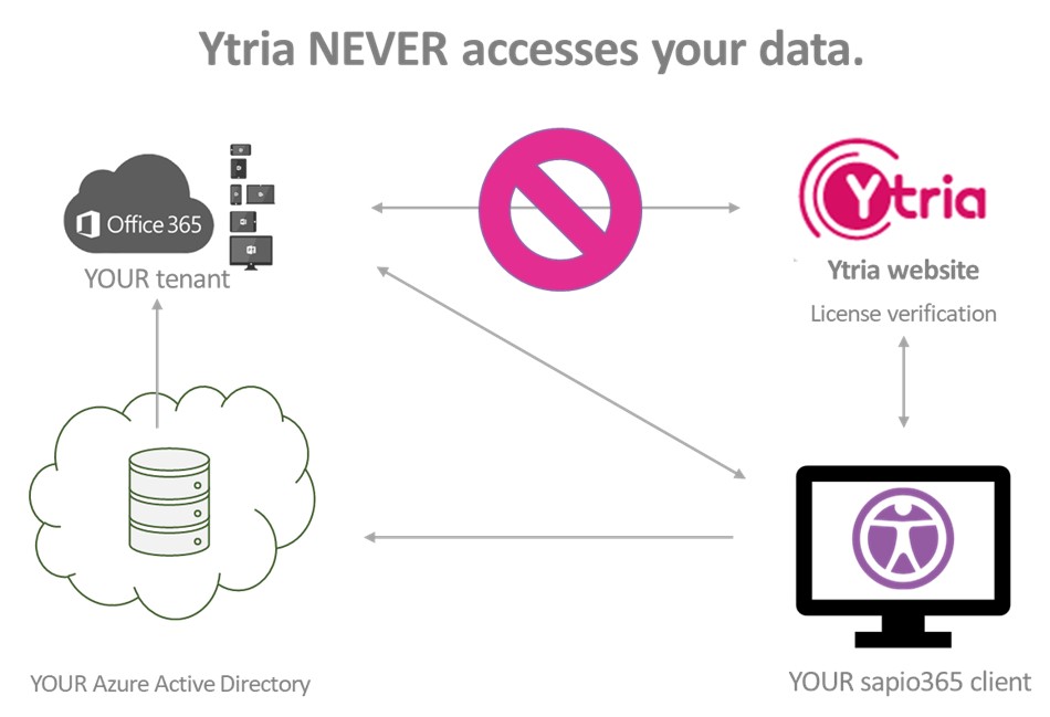 The only information that flows between the sapio365 client and Ytria is license key authentication calls and crash log reporting which is controlled by the user.