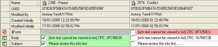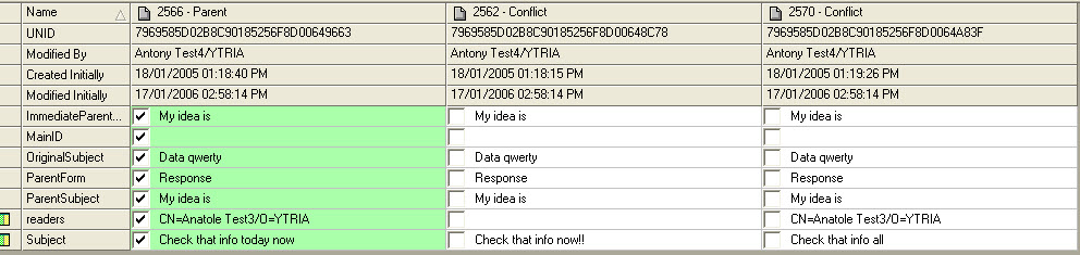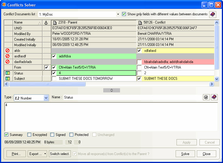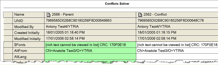 TheConflict Solverallows you to see all the conflicts in a database (all the documents with $Conflict fields and their parent documents). By comparing the values of each document in the table, you can then select which field values you want to keep and any you want to discard.