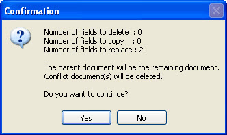 Push 'Solve' button to update the parent document and delete all conflict documents. A confirmation dialog will popup with the summary of how many fields will be deleted, copied and replaced. You can decide to continue or cancel the operation from there.