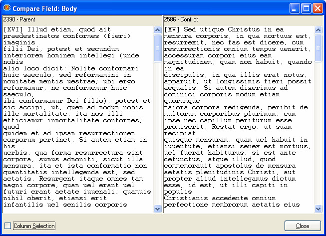 You can compare fields side by side, just like in theDocument Comparator,by double-clicking a field in theConflict Solver: