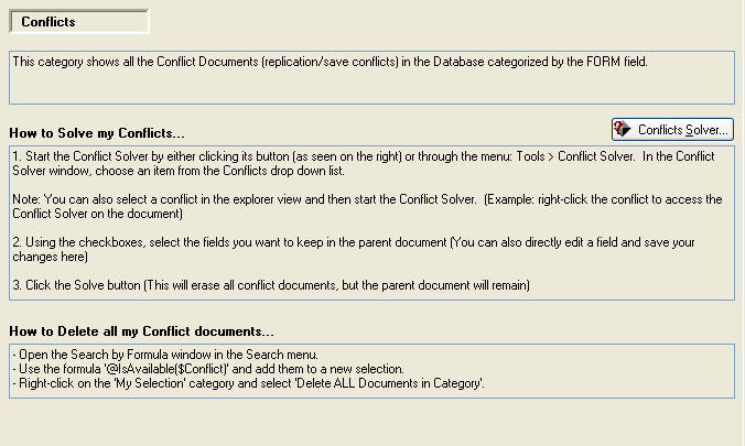 When you select the Conflict category in the selection tree, the panel below will appear on the right side. From there you can launch the Conflict Solver on all the conflicts in the database. To go directly on a particular conflict, select it in the Selection Tree and click on the Conflict Solver button in the toolbar.