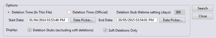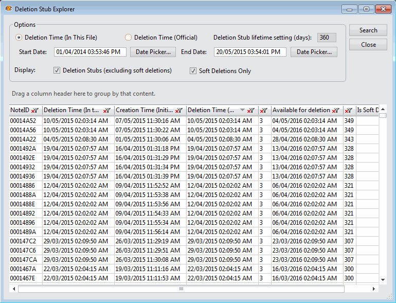 When your settings are done, click Search to populate the Deletion Stub Explorer grid.