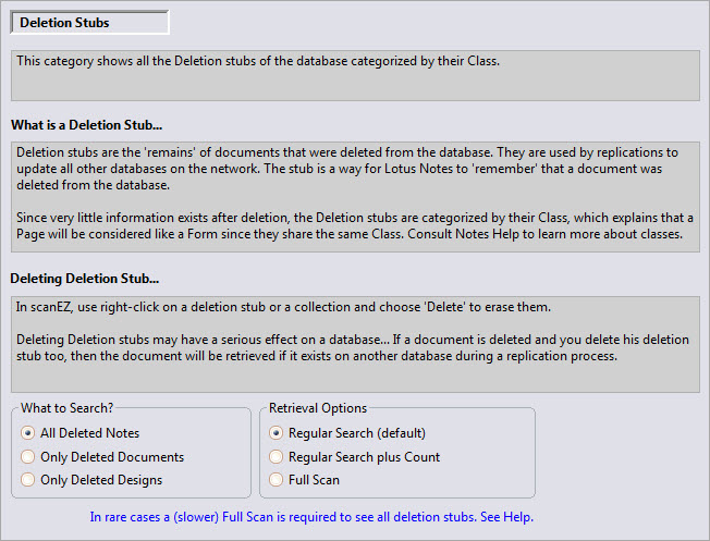 - Regular Search (default): This option is usually the fastest way for scanEZ to retrieve a database's deletion stubs. However in rare instances, some deletion stubs will not be found using this method (Our testing found that the problem of 'Regular Searches' failing to find all deletion stubs is only likely to occur when looking at local names.nsf databases).