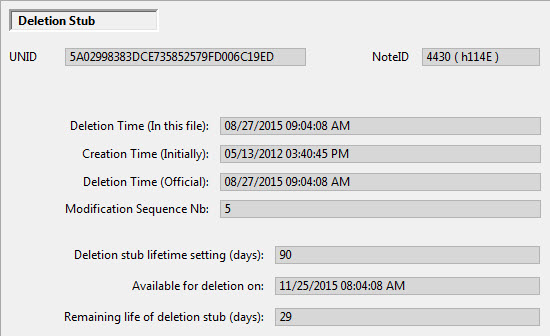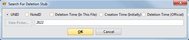 - Search For Deletion Stub: This lets you search for a deletion stub using any of the following criteria: UNID; NoteID; Deletion Time (In This File); Creation Time (Initially); Deletion Time (Official).