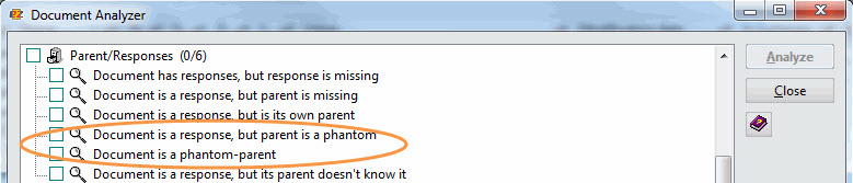 The Document Analyser offers the option to find all response documents whose parents are 'phantoms'.