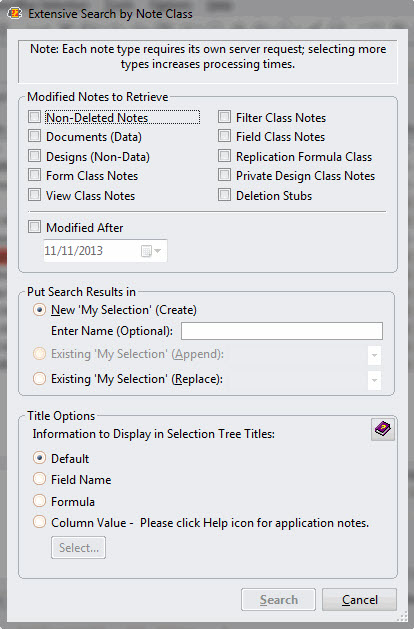 | TIP | Extensive Search by Note Class is often handy when trying to track down documents affected with the Field is too large (32K) error in Lotus Notes. For application notes, please read following article at the Ytria Tech Lab: When the dreaded “Field is too large (32K)” Lotus Notes error strikes |