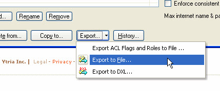 The Export to File... button in scanEZ's ACL panel lets you export the information you see in the grid to either an HTML or text file for external analysis. This option works in the same manner as many other Ytria products' Export function. One special note: the Export ACL Flags and Roles to File option will export the information displayed when Show Flags is selected plus the information displayed when Show Roles is selected.