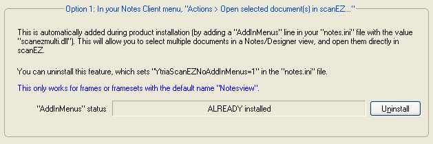 By default, when you first install scanEZ, the Multiple Document Selection feature is installed. When this feature is installed you'll see an entry in your notes.ini file named "AddInMenus" with the value "scanezmulti.dll". If it isn't installed you should see a notes.ini entry named "YtriaScanEZNoAddInMenus".