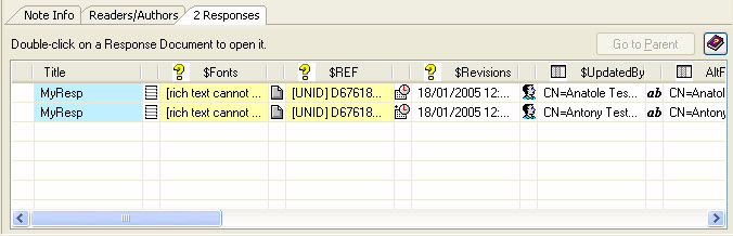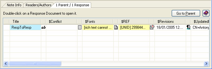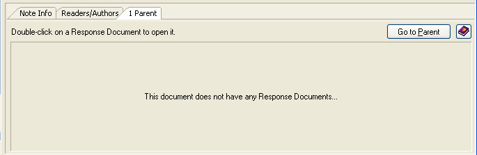 The response tab appears when a document is either a response or parent of other documents. The list allows you to see all the responses (access them by double-clicking) and, if the document itself is a response, you can access its parent with the 'Parent' button.