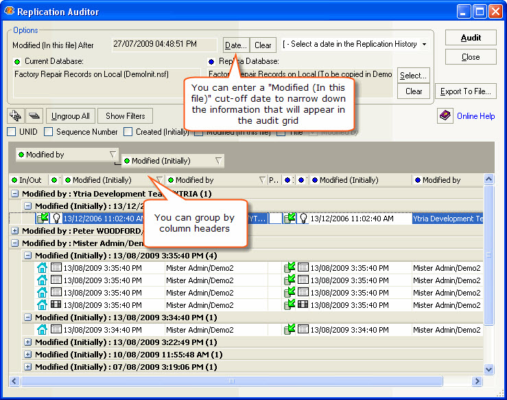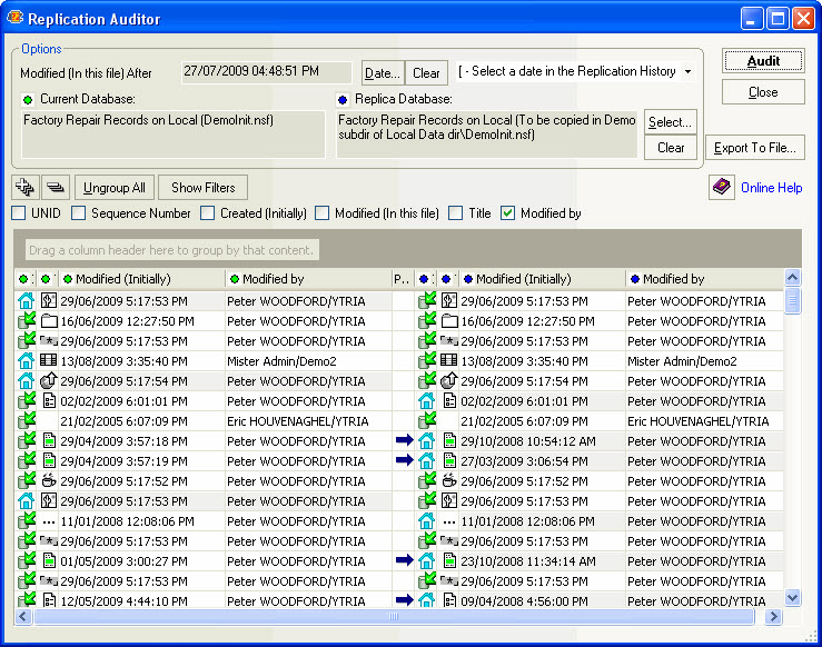 Arrows quickly help you identify the Push / Pull (or Send / Receive) of elements that would occur in the next database replication. In addition, potential replication conflicts are automatically identified, giving you a chance to fix the problem before it occurs.