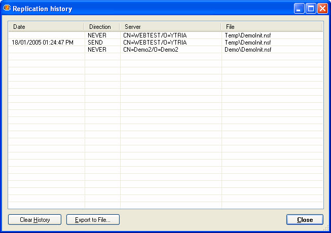 The Replication history displays the same information as in the Lotus Notes client, but allows you to export the information to a file.