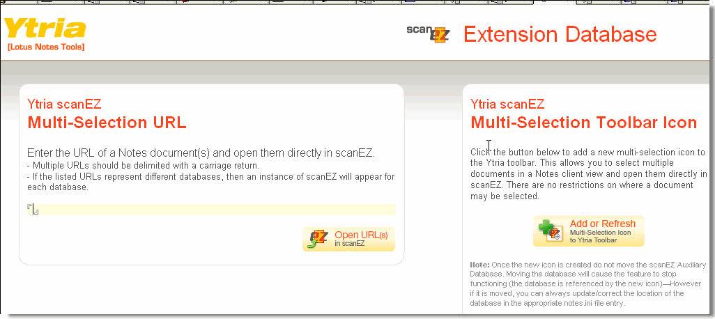 The scanEZ Extenion Database lets you add the multi-selection Icon to the Ytria toolbar plus it provides a place to enter URLs of Notes documents and open them in scanEZ.