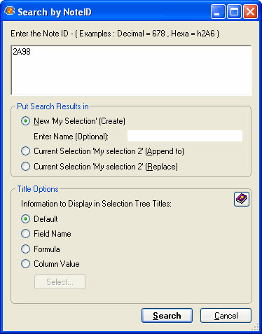 To perform a search by NoteID, simply type the NoteID in the dialog box in decimal or hexadecimal format and select where you want to put the search results.