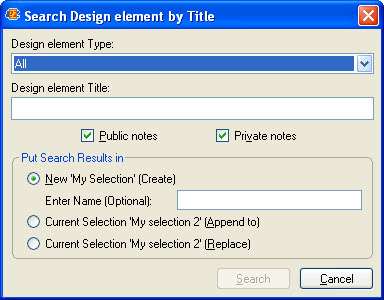 To perform a search on design elements by Title, simply select which design element type you want, the design element title you want to search and select where you want to put the search results.