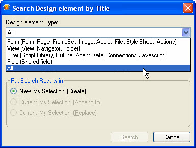 This dialog box lets you choose the type of Design element to search via a pull-down menu. The following types are available for the search: