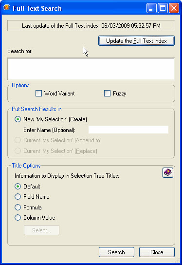 - New 'My Selection': If this is checked, a new 'My Selection' virtual folder will be created, containing the result of your Full Text search. You have the option of entering a name for the virtual folder (if left blank, the default 'MySelection#' naming scheme will be used).