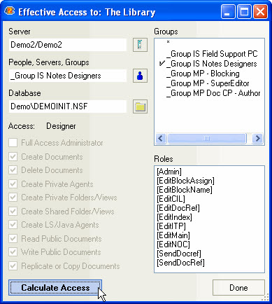 The Effective Access dialog offer the same information as you'd find in the Effect Access dialog in Lotus Notes with the added advantage of allowing you to quickly change the server and database. This allows you to check an ACL entry's Effective Access in several places very quickly and conveniently.