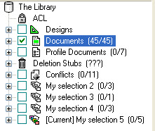 - At the left, the Selection Tree which lists every note contained in a database, categorized by type (ACL, Design notes, Documents, Profile Documents, Deletion Stubs and Conflict Documents).