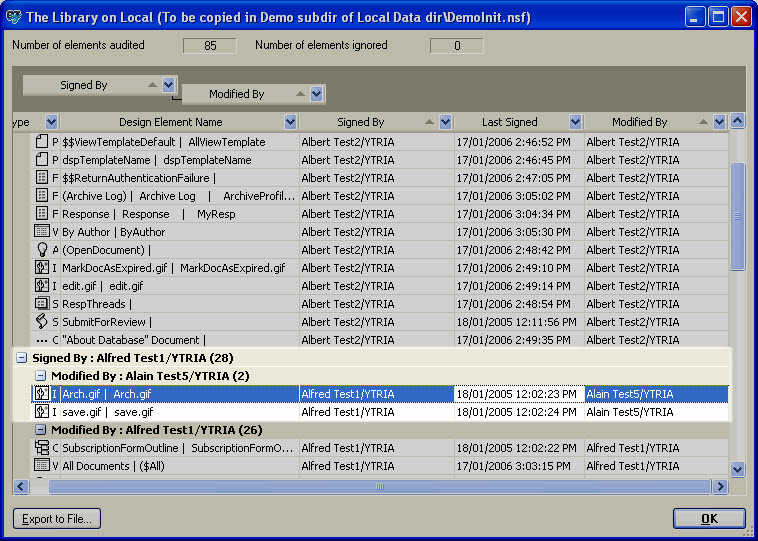 For example, in this screenshot we see that two images have been signed by Alfred Test1 yet the last modification was performed by Alain Test5. In this case, signEZ was first launched with the ID 'Alain Test5' and we chose to sign with Alfred's ID. This kind of situation only happens with local databases.