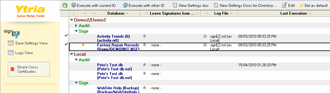 | Execute with current ID | This action has two available subactions: Execute with Current ID>Using Selected Settings doc(s): This option will prompt signEZ to process each selected document with your current ID. Execute with Current ID>On Other Target Database(s) Using Selected Settings doc: This option will use the selected settings document as a template for signing/auditing settings. The action will prompt you to choose a target database* in a "Select an Application" dialog. *You can also select multiple target databases by using Ctrl + left-click in the "Select an Application dialog." | ||||