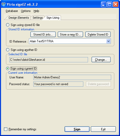 This option lets you sign the database with your current ID. In this situation, signEZ does not prompt for your password since it does not need to switch ID.