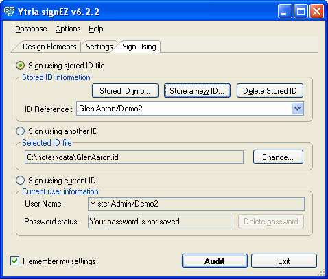 In this tab you can choose the ID you want to sign the design elements with; change or get more information about stored signature IDs; and delete stored IDs. The following options are available : Sign using a stored ID file, Sign using another ID, and Sign using current ID.