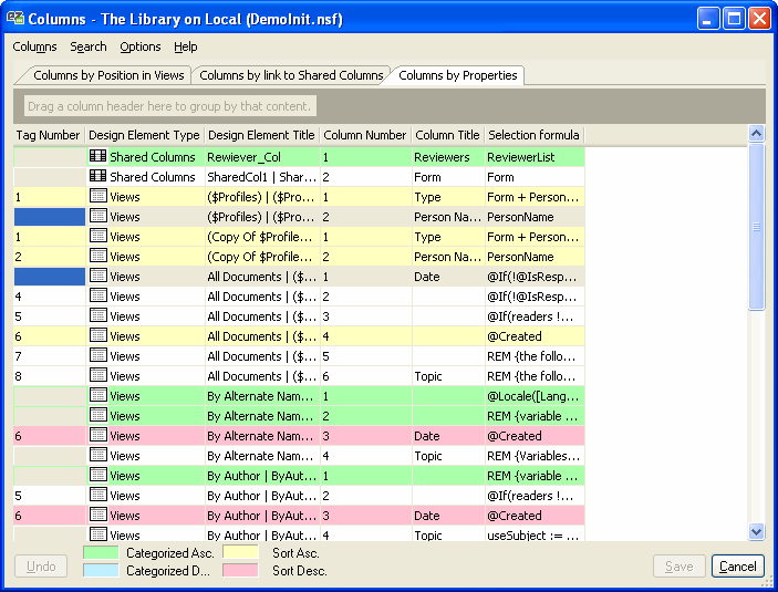 This tab displays design elements along with their properties. In the right-click menu, Properties Selection... window you can select the column properties you want displayed. The Columns by Properties tab uses the grid interface.
